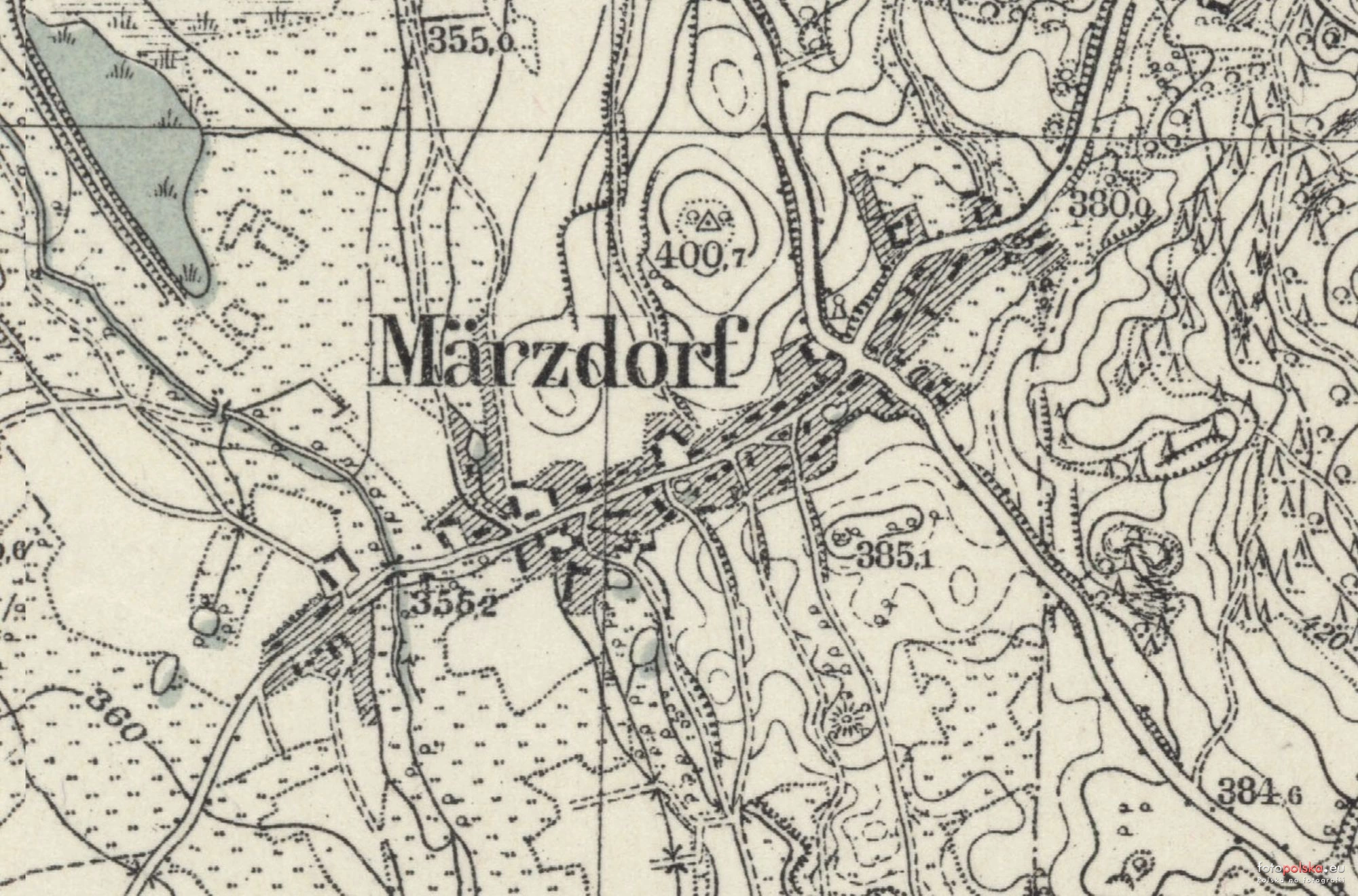 1930 , Marczyce (niem. Märzdorf) na fragmencie niemieckiej mapy topograficznej (arkusz 3009 "Bad Warmnrunn"). Podkład mapy został sporządzony 1886 r., poprawiony w 1924 r. z uzupełnieniami z 1930 r. Widoczne m.in. miejsce w którym znajdował się pomnik (zapewne niegdyś pomnik poległych w I wojnie - obecnie w miejscu tym stoi kapliczka) oraz punkt triangulacyjny na pobliskim wzgórzu. |