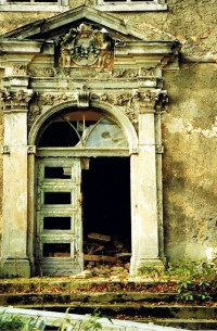 22 października 1998 , Pałac w Giebułtowie. Portal wejścia frontowego. Zdjęcie nie najlepsze, ale widać tu jeszcze kartusz herbowy i jedno skrzydło drzwiowe. Teraz tych elementów już nie ma.Skomentuj zdjęcie |