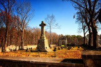 „Na północny zachód od Rajbrotu, znajduje się cmentarz wojskowy nr 303, duże, uroczyste pole cmentarne, które stosownie do swego znaczenia zbudowane zostało ze szczególnym zaangażowaniem nakładów – to znów słowa Hansa Hauptmanna i Henryka Brocha. Cmentarz w swoim założeniu miał być jednym z bardziej reprezentatywnych Kriegerfriedhoff na tym terenie, a to w związku z tym, iż pochowani zostali tutaj sojusznicy Austro-Węgier żołnierze pruscy. Cmentarz założony na planie prostokąta, ze ściętymi zachodnimi narożami i półkolistym występem od wschodu, na osi założenia. Otoczony został pełnym, kamiennym murem, podwyższonym uskokami w narożach i w liniach bocznych ogrodzenia. Po bokach dwie kamienne ławy. Wejście ujęte monumentalną, kamienną bramą . Portal bramny zwieńczony frontonem, a w jej tympanonie wyraźnie zaznaczony krzyż grecki. Masywny charakter bramy wzmocniony został poprzez zastosowanie od strony drogi ukośnych przypór filarów. Wejście zamykają dwuskrzydłe, żelazne, częściowo ażurowe wrota. Pośrodku cmentarza, na osi założenia na krepidomie i postumencie o ośmiobocznym przekroju z kamiennych ciosów, wysoki, kamienny krzyż z drzewcem ujętym półwałkami. Na tej też osi, na zachodniej ścianie ogrodzenia denkmanswald (ściana pomnikowa) zwieńczona niewielkim kamiennym krzyżem na małym cokole. Na licu ściany znajdowała się tablica inskrypcyjna z napisem „Brama śmierci prowadzi wiernych ku nieśmiertelności”, niestety zniszczona. Pod tablicą kamienna ława ujęta policzkami. Układ grobów w rzędach prostopadłych do osi założenia. W przedniej części cmentarza (bliżej bramy) znajdują się betonowe stele zakończone dwuspadowo, z żeliwnymi tablicami w płycinie lica. Po lewej stronie leżą żołnierze pruscy (a wśród nich wielu Polaków – część walczących pułków pochodziła z Wielkopolski), po prawej zaś – rosyjscy. Po obydwóch stronach centralnego pomnika znajdują się place, które zapewne służyć miałyby przyszłym (w mniemaniu twórców cmentarzy) patriotycznym uroczystościom. Za pomnikiem skromniejsze mogiły – na niskich betonowych podstawach żelazne krzyże z prętów. W 12 pojedynczych grobach i 36 zbiorowych mogiłach pochowanych zostało 55 żołnierzy austriacko-węgierskich, 176 niemieckich oraz 299 rosyjskich. W okresie międzywojennym na cmentarzu tym odprawiane były w dniu Święta Niepodległości Msze Święte w intencji Ojczyzny, oraz odbywały się uroczyste akademie. Z tyłu ściany pomnikowej znajduje się niemiecka inskrypcja wykuta w kamieniu w roku 1914– „Drogim Przyjaciołom z naszej kochanej Armii”. Tablica ta była elementem pomnika stanowiącego element centralny wystroju tymczasowego i jako taka została przez budowniczych przy przebudowie na trwały wystrój włączona do niego. Prawdopodobnie gdyby była staranniej wykonana może znalazłoby się dla niej miejsce nawet w środku Przy szosie prowadzącej do Rajbrotu znajdują się kamienne schody od których niegdyś wiodła ku bramie droga. Cmentarze te są tradycyjnie od wielu lat porządkowane przez młodzież szkolną.