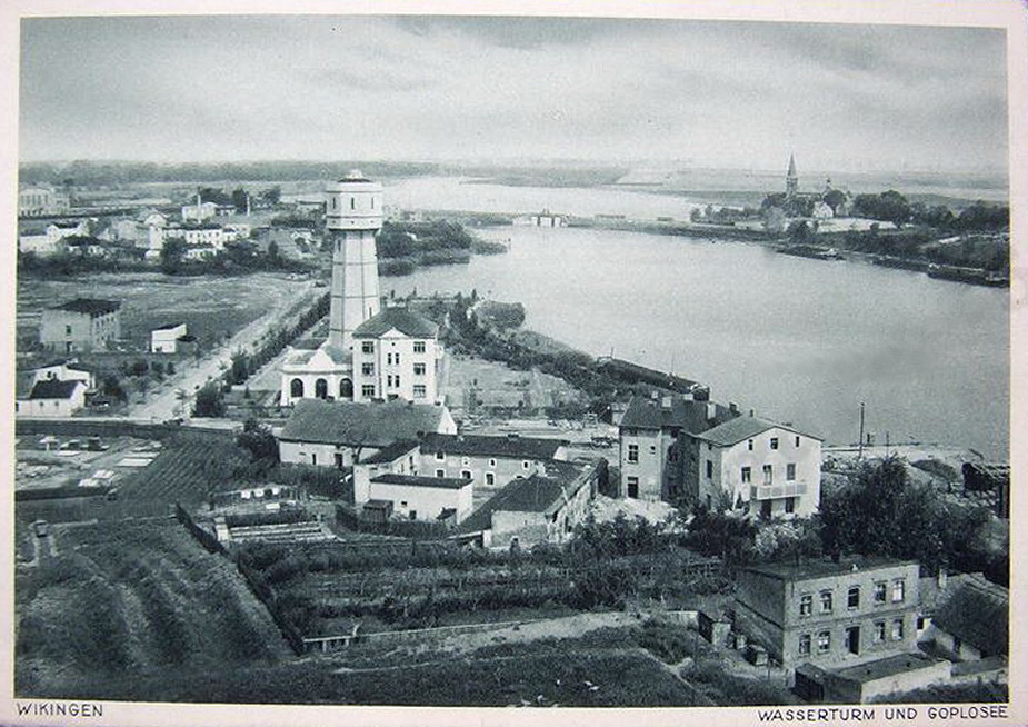 Lata 1940-1944 , Ulica Zamkowa prowadząca na most (w prawo). Za wieżą do góry to ulica Portowa.Skomentuj zdjęcie