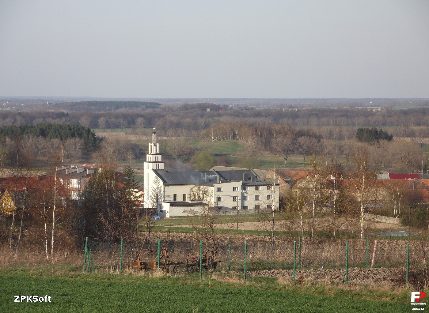 9 kwietnia 2012 , Kościół Narodzenia NMP z 1932r. wraz z plebanią widziany od strony południowej. Z lewej strony widoczny zespół szkół w Kuropatniku.Skomentuj zdjęcie