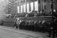 Lata 1976-1978 , Pochód 1 majowy.Trybuna honorowa prze budynkiem komitetu miejskiego PZPR.Skomentuj zdjęcie |