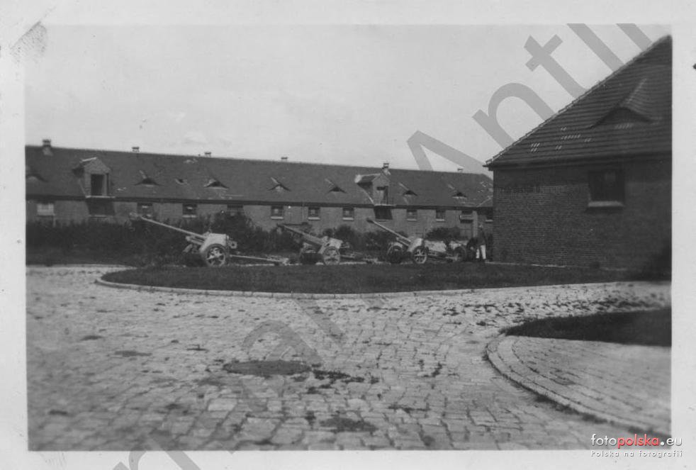 1943 , Niemieckie działa przeciwpancerne typu PaK, kalibru 75 mm na tle koszarowych magazynów.Skomentuj zdjęcie