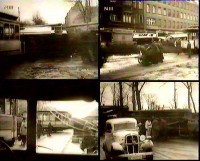 luty 1945 , Kadry z "Deutsche Wochenschau 1945.02.17" z Wrocławia. Dwa kadry u górze mogą przedstawiać tą samą okolicę gdyż pokazane były po sobie z innym kadrem w międzyczasie. Jeżeli miejsce jest to samo to będzie dało się to może zidentyfikować po zabudowie (linia tramwajowa + niezabudowana do końca pierzeja). Kadr z lewej na dole to prawdopodobnie ulica Sienkiewicza (słynna scena z jazdą samochodem po okolicach pl.Grunwaldzkiego). Prawy dół - nie wiem, jakieś odludzie z linią tramwajową (jest nawet rozjazd).Skomentuj zdjęcie