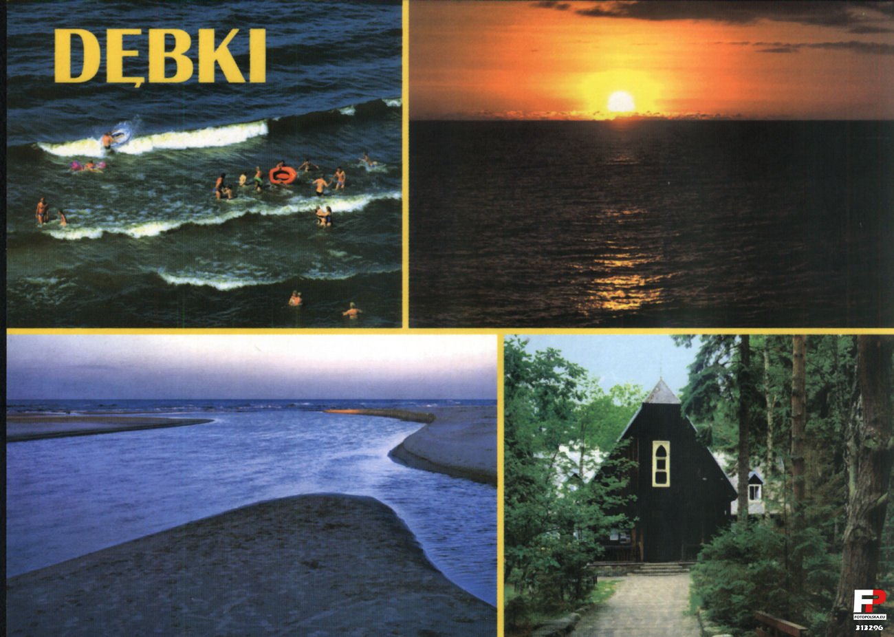 Lata 1995-2000 , Dębki. Kąpiel w morzu, zachód słońca nad Bałtykiem, ujście rzeki Piaśnicy do morza, kaplica Księży Zmartwychwstańców (1934-1935). |
