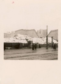 1942 , Marszałkowska, przy wylocie Próżnej, ujęcie w kierunku północno-zachodnim. W tle po lewej widać dom Zielna 47 i fragment Pałacu Janaszów Czackich - Zielna 49. [Piotr Niewiadomski].Skomentuj zdjęcie