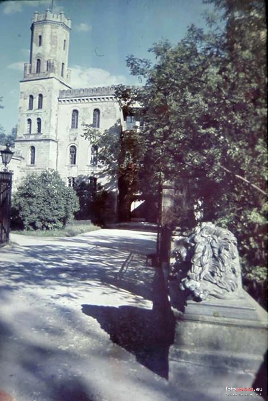 Lata 1935-1939 , Świerklaniec - Widok od strony fasady frontowej od zachodu. Przed bramą wjazdową rzeźba lwa.
