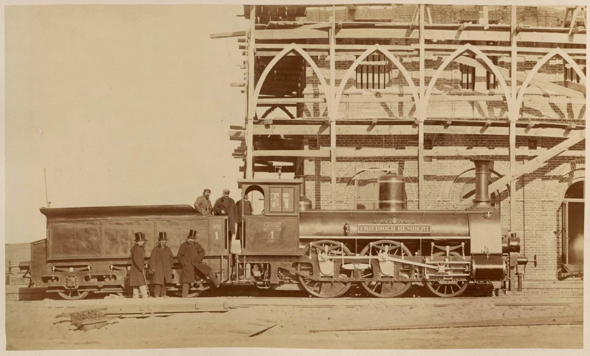1867 , Lokomotywa "Friedrich Rembert" przy budowie Dworca Terespolskiego. Fot. "Droga żelazna warszawsko-terespolska 1866".Skomentuj zdjęcie |