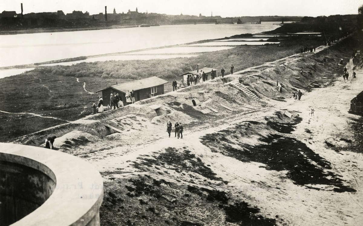 sierpień 1915 , Rosyjskie okopy na Pradze w wa;e przeciwpowodziowym. Widok z Mostu Poniatowskiego. W tle Wisła ze zniszczonym Mostem Kierbedzia i Stare Miasto. Dziś biegnie tędy Wybrzeże Szczecińskie.Skomentuj zdjęcie