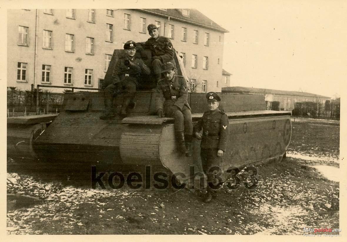 1944 , Drewniana atrapa czołgu na terenie koszar.Skomentuj zdjęcie
