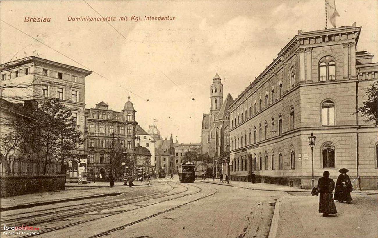 1907 , Plac Dominikański około 1907 roku. Z lewej strony wyloty dawnych zaułków, które znajdowały się w miejscu w którym stoi Galeria Dominikańska - ich zabudowa została niemalże doszczętnie zniszczona w 1945 roku - ostała się tylko jedna kamienica (przy ulicy Nowej) z kilkudziesięciu które tam stały... a ona została rozebrana w latach 60. lub 70.Skomentuj zdjęcie |
