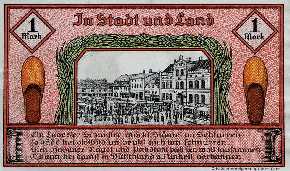 1921 , Rynek z budynkiem ratusza w Łobzie. Rysunek na banknocie zastępczym z 1921 roku.Skomentuj zdjęcie