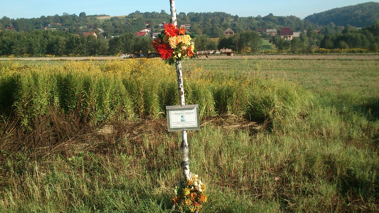 10 września 2012 , Pamiątkowy brzozowy krzyż ustawiony w miejscu śmierci kpt. pil. Mieczysława Medweckiego 1.09.1939Skomentuj zdjęcie |