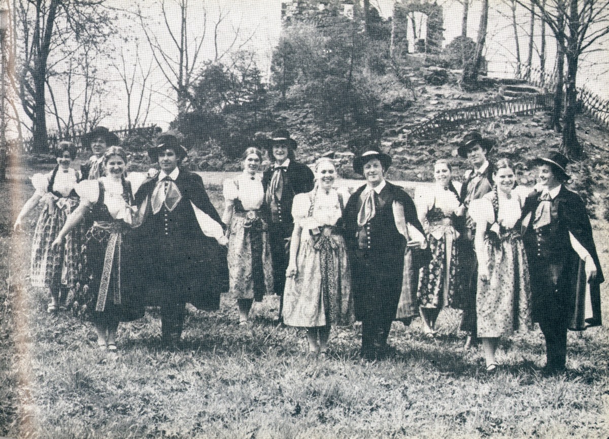 Lata 1975-1978 , Zespół pieśni i Tańca ZC na głównym trawniku góry zamkowej. W tle tzw. sztuczne ruiny, obecnie odtworzona częściowo wieża ostatecznej obrony. Zdjęcie z książeczki "Cieszyna droga do Polski".Skomentuj zdjęcie