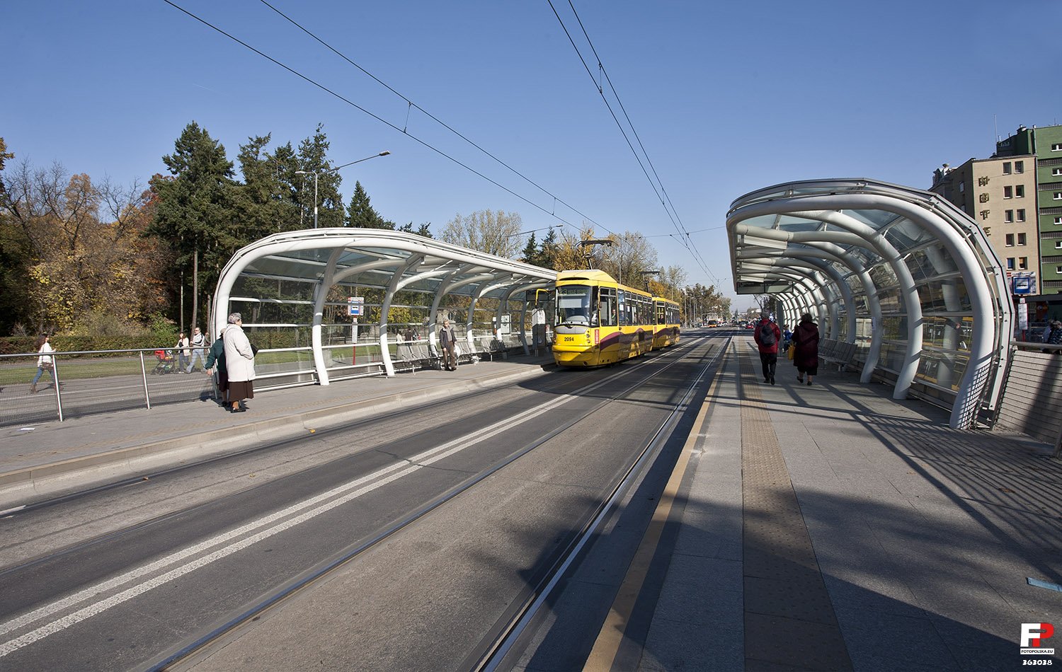 18 października 2012 , Perony przystanku tramwajowego. Podwójna linia ciągła, by tramwaje nie zbaczały z toru. W parku, który widać z prawej, pardon - z LEWEJ, niedaleko jest miejsce, w którym mieszka niedźwiedź (chyba brunatny, taki zwyczajny). Można go podziwiać cały rok.Skomentuj zdjęcie