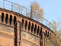 18 września 2012 , Owalne budynki stanowiły obudowę zbiorników z gazem. Są bardzo chrakterystyczne, widać je w wielu filmach polskich. Teren jest niedostępny (prywatny, ochrona itd.), a budynki w stanie dramatycznym. Zbliżenie na finezyjnie murowany gzyms koronujący z całkiem sporymi brzózkami.Skomentuj zdjęcie
