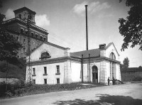 Lata 1924-1945 , Elektrownia "Narew" twierdzy Modlin istniejąca do dziś lecz jest zdewastowana i zarośnięta zielenią, ponad elektrownią widoczna wieża "Biała" cytadeli twierdzy ModlinSkomentuj zdjęcie