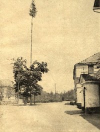 1929 , Czterdziesto metrowy Słup Majowy ustawiony na skrzyżowaniu dróg. Po prawej widoczna barokowa kapliczka.Skomentuj zdjęcie