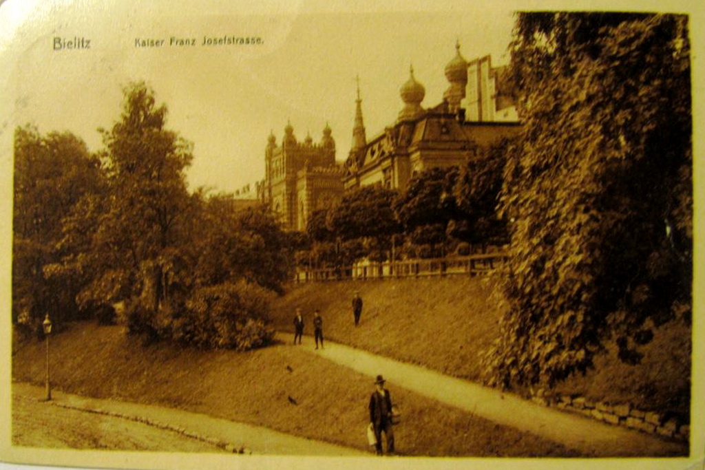 Lata 1900-1916 , Fragment ulicy 3 Maja z widocznymi kopułami synagogi w Bielsku.Skomentuj zdjęcie |