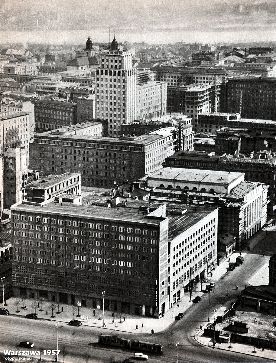 Lata 1957-1958 , Fragment ulicy Sienkiewicza od Marszałkowskiej. W głębi budowa - zabudowa śródmieścia.Skomentuj zdjęcie