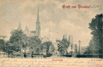 Dzielnica Ostrów Tumski więcej zdjęć (442) Atrakcja turystyczna Dawniej: Dominsel Most Tumski więcej zdjęć (286) Zbudowano: 1888-1889 Dawniej: Dombrücke Most Tumski we Wrocławiu – dwuprzęsłowy stalowy, nitowany most zbudowany w roku 1889 nad północną odnogą Odry pomiędzy Ostrowem Tumskim a Wyspą Piasek, na miejscu wcześniejszego mostu drewnianego. Do roku 1945 nosił nazwę Dombrücke. Poprzednie konstrukcje, funkcjonujące w tym miejscu co najmniej od XII wieku, wyznaczały granicę pomiędzy jurysdykcją miejską (na Wyspie Piaskowej) i kościelną (na Ostrowie Tumskim). Most ten był wielokrotnie niszczony i naprawiany, zachował się m.in. przekaz opisujący katastrofę pod przechodzącą w 1423 roku przez most procesją Bożego Ciała. Przez kolejne stulecia funkcjonował zazwyczaj jako drewniana konstrukcja trójkątno-wieszarowa z jednym przęsłem zwodzonym, w połowie XIX wieku była to już budowla trapezowo-wieszarowa ze stałym pomostem. Długość obecnego, stalowego mostu wynosi 52,19 m, szerokość pomostu – 6,84 m, wysokość portalu – 6,90 m, przęsło – 25,19 i 25,93 m. Konstrukcję stalową kratownicową systemu Gerbera wyprodukowaną w Hucie Piła (Pielahütte) nad kanałem Kłodnickim w Rudzińcu (Rudzinitz) koło Gliwic (mimo znacznej odległości od Wrocławia funkcjonujące już wówczas połączenie wodne umożliwiało stosunkowo niedrogi i łatwy transport elementów mostu barkami) zmontowały zakłady G. Ruffera, a wykończone zostały przez zakład metaloplastyczny Gustawa Trelenberga. Roboty kamieniarskie powierzono firmie Granit und Quarz. Bramka portalowa oraz górna część kratownic nie pełnią de facto żadnych funkcji konstrukcyjnych. W roku 1945 most przeszedł remont kapitalny. Usunięto wówczas najpoważniejsze uszkodzenia, jakich doznał w czasie oblężenia Festung Breslau. Pomimo to pozostały na niektórych elementach mostu ślady ostrzału i trafień odłamkami. Ostatni kapitalny remont most przeszedł w 1992 roku, wówczas zastąpiono w nim dotychczasowy pokład z kształtowników Zoresa nowym rozwiązaniem ze spawanych blach z żebrami poprzecznymi, opartymi na podłużnicach. 15 października 1976 most wpisany został do rejestru zabytków. Przy moście, na brzegu Wyspy Piasek, stoją od 1893 roku figury św. Jadwigi (po lewej stronie mostu) i św. Jana Chrzciciela (po prawej), dłuta Gustawa Grunenberga. Przy Moście Tumskim znajdują się ręcznie obsługiwane i sprawne zabytkowe lampy gazowe. Szerokość jezdni na moście wynosi 4,50 m, a dwa chodniki mają po 1,17 m każdy. Ze względu na jego zabytkowy charakter ruch wszelkich pojazdów samochodowych bez zezwoleń przez ten most jest obecnie zakazany, a jego maksymalne dopuszczalne obciążenie ustalono na 10 ton. Źródło ul. Najświętszej Marii Panny więcej zdjęć (753) Dawniej: An der Sandkirche |