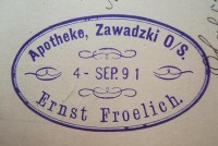 4 września 1891 , Pieczęć apteki z Zawadzkiego, należącej do Ernsta Froelicha. Jak widać, pieczęć przystawiono 4 września 1891 roku. Zdjęcie ma niestety mały format, ale ponieważ jest to unikat, to postanowiłem je tu umieścić.Skomentuj zdjęcie |