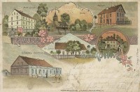Lata 1900-1910 , Gruss z Gołkowic. Od góry: szkoła katolicka, kościół, urząd celny, szkoła ewangelicka, pałac oraz zajazd należący do O. Fischera.Skomentuj zdjęcie