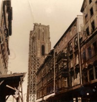 21 września 1975 , Perspektywa ulicy Kiełbaśniczej z wieżą kościoła św. Elżbiety. Foto zrobione dzień po pożarze w 1975 roku.Skomentuj zdjęcie