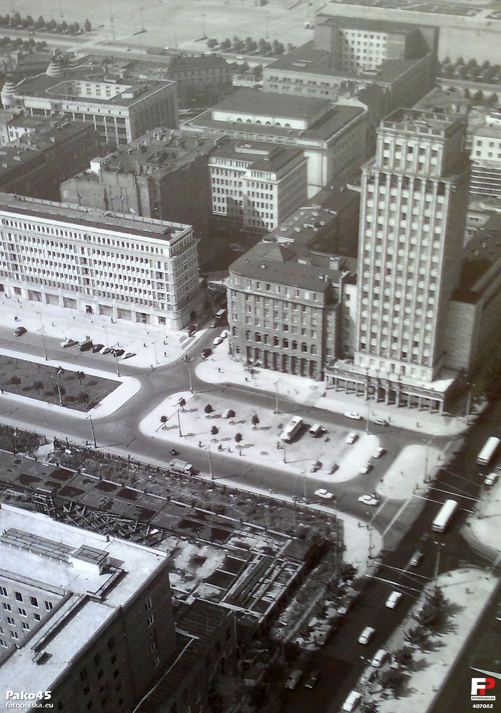 1961 , Plac Powstańców Warszawy z lotu ptaka, w centrum kadru gmach hotelu Warszawa (Prudential). Na dole fotografii początki budowy "nowej" części zespołu NBP. Reprodukcja z wystawy plenerowejSkomentuj zdjęcie