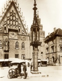 Lata 1895-1899 , Pręgierz na tle wschodniej ściany ratusza.Skomentuj zdjęcie