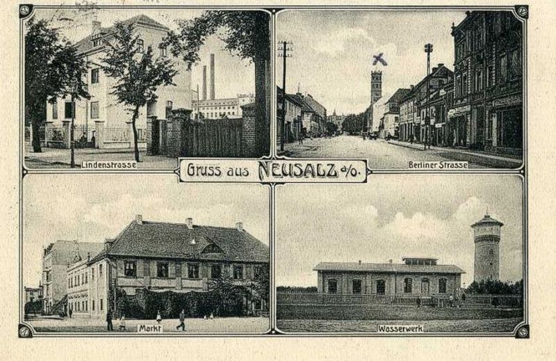 1916 , Czteropolowa widokówka z Nowej Soli. W górnych polach ukazano budynek przy ul. Muzealnej 40 i fragment ul. Piłsudskiego. W dolnych Rynek i miejskie wodociągi.Skomentuj zdjęcie |