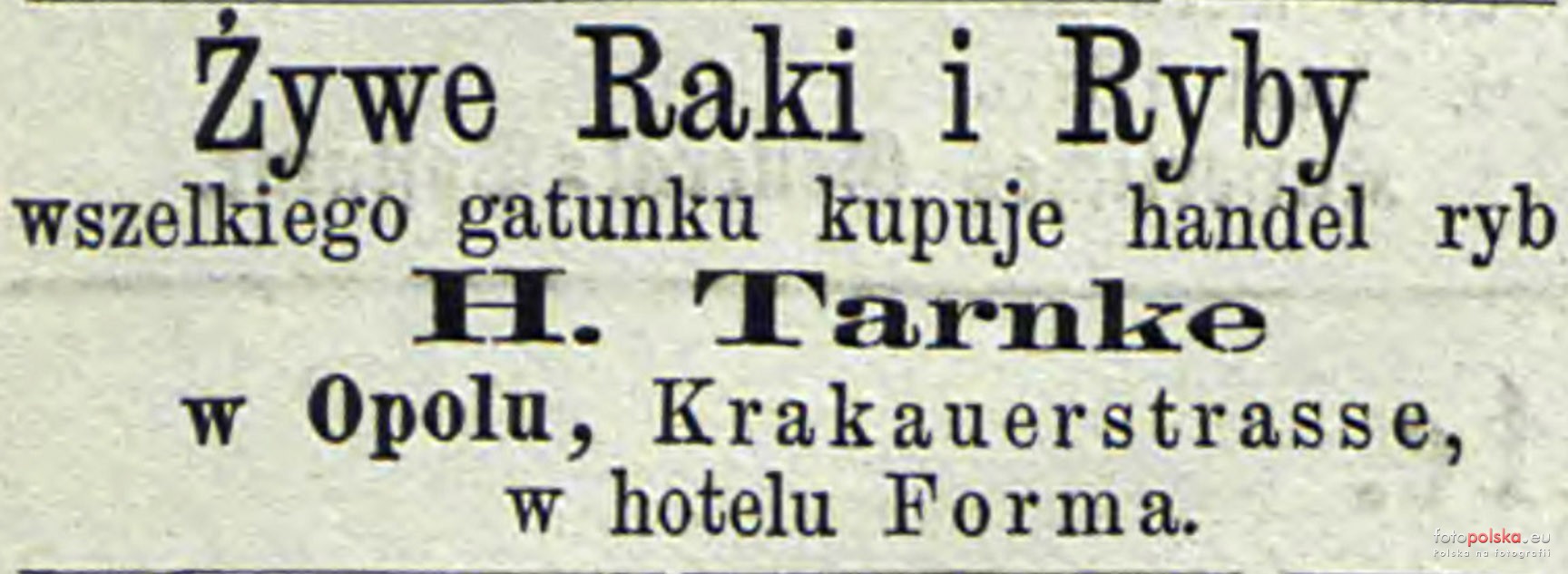 1867 , Reklama sklepu rybnego prowadzonego przez H. Tarnke. Źródło: "Oppelner Kreisblatt" z 1876 roku.Skomentuj zdjęcie
