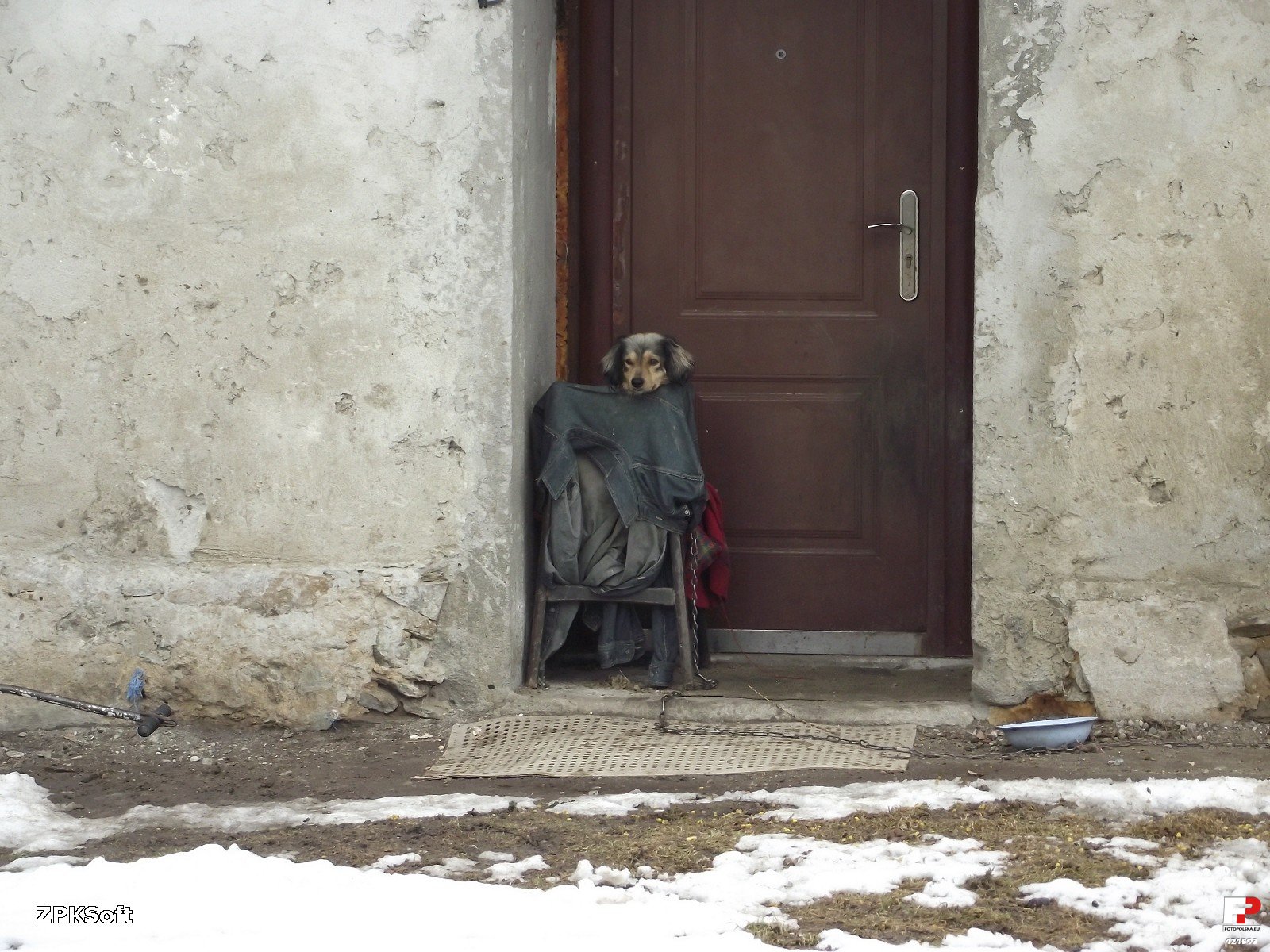 7 kwietnia 2013 , Zdjęcie fragmentu budynku od strony wschodniej, gdzie przy wejściu funkcjonuje tekstylno-drewniana buda dla psa i to całoroczna. Piesek wita wszystkich przechodzących na ile łańcuch pozwala, zwłaszcza zmierzających do kościoła (po drugiej stronie dróżki). Jeśli fotka poza tematem- usunę.Skomentuj zdjęcie