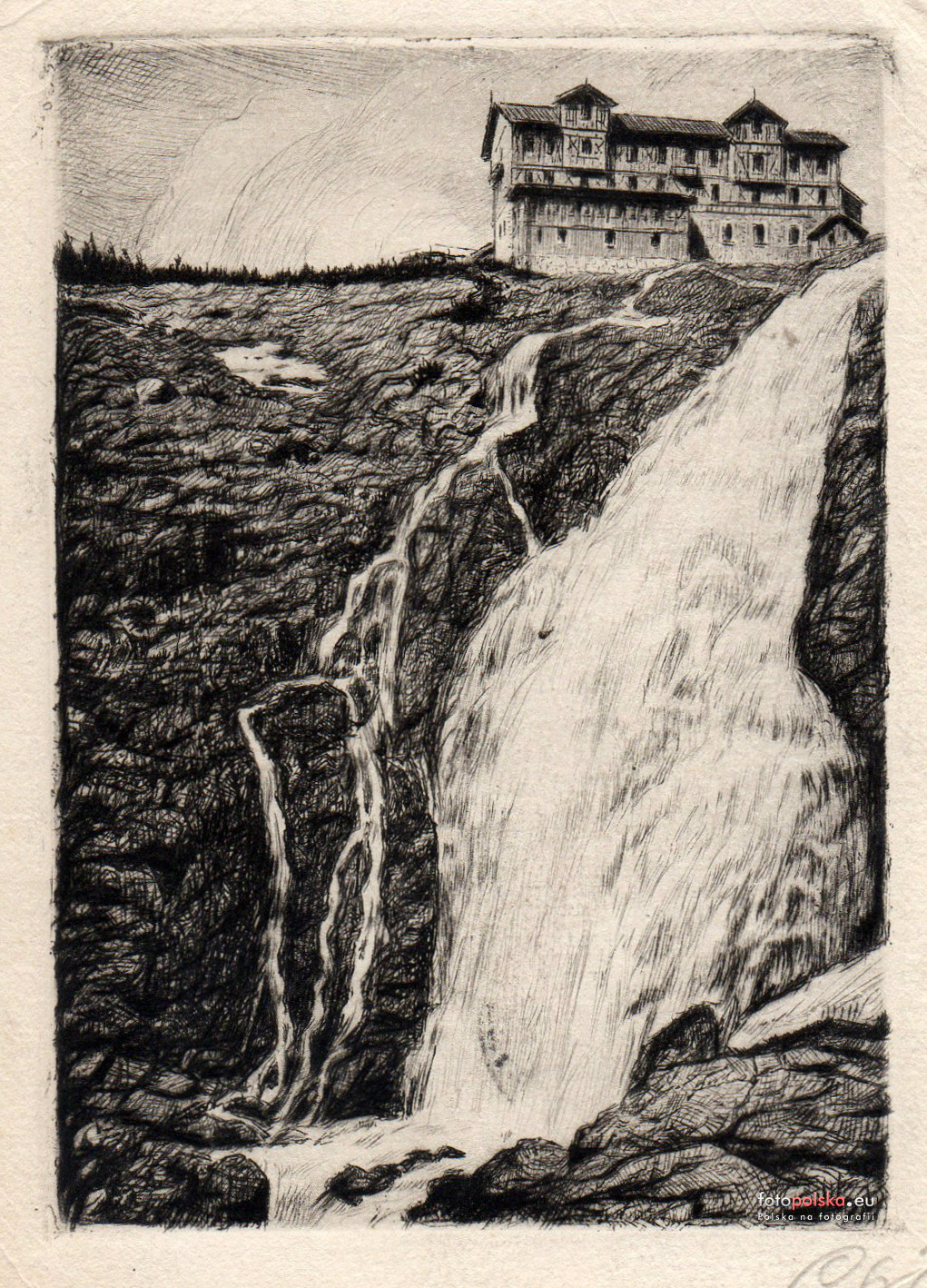 1943 , Wodospad i schronisko Labska Bouda.Skomentuj zdjęcie