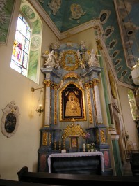 4 sierpnia 2013 , Boczny, barokowy ołtarz, wykonany przez Christiana Jahne, architekta sprowadzonego przez księcia pszczyńskiego z Moraw. W ołtarzu, widoczny odsłonięty temperowy wizerunek Matki Boskiej z Dzieciątkiem Jezus, pochodzący z 1764 roku, zamówiony u Jana Adermanna z Żar. Obraz ten przedstawia Matkę Boską Pszczyńską, zwaną także Przedziwną.Skomentuj zdjęcie