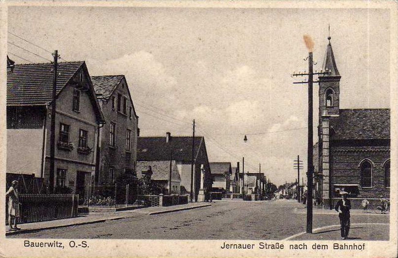 Lata 1930-1938 , Ulica Powstańców. Widok ze skrzyżowania z ul. Opawską przy kapliczce w kierunku dworca kolejowego.Skomentuj zdjęcie