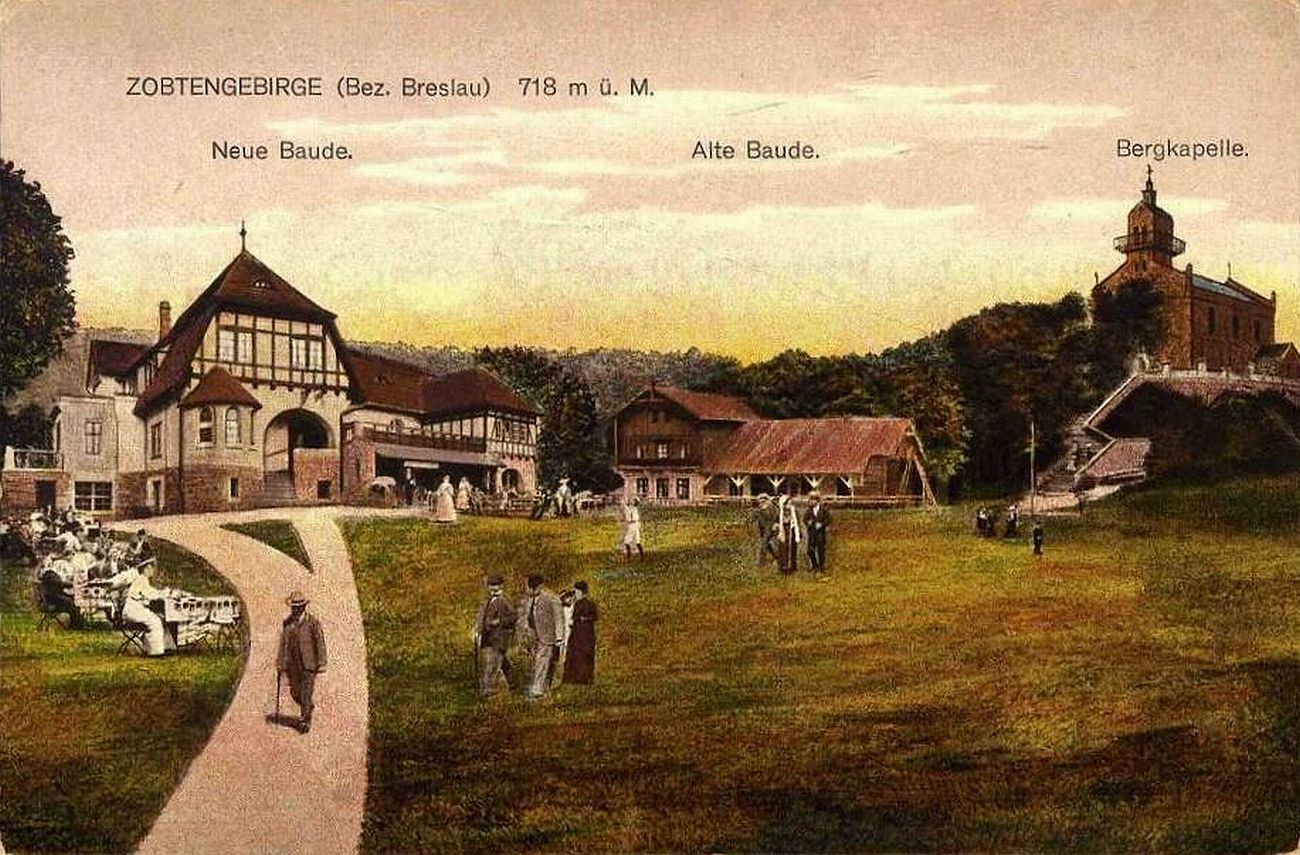 Lata 1910-1920 , Szczyt Ślęży z nowym i starym schroniskiem oraz kościołem Nawiedzenia NMP.Skomentuj zdjęcie |