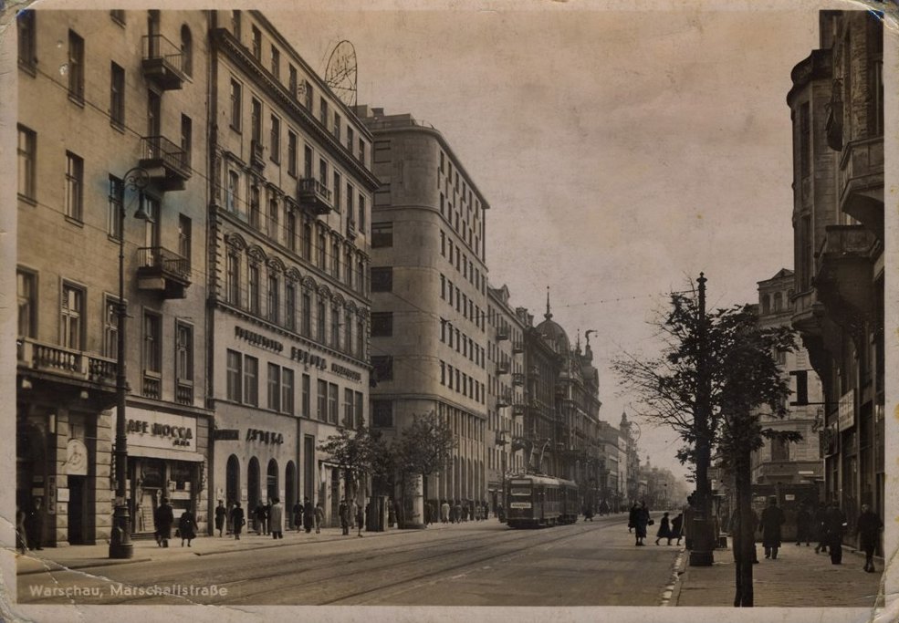 1942 , Ulica Marszałkowska, od lewej Kamienica Braunsteina pod nr. 138, Marszałkowska 136 róg Świętokrzyska 44, Centrala PKO przy Marszałkowskiej 134 róg Świętokrzyska 37, Marszałkowska 132, kamienica Jankowskiego przy Marszałkowskiej 130 róg Moniuszki 12 i Towarzystwo Ubezpieczeń "Rosja" pod numerem 124/128Skomentuj zdjęcie