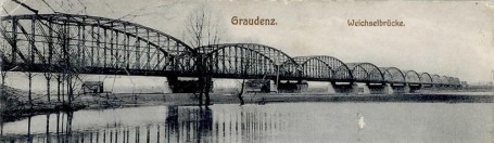 W latach 1876-1879 powstał jedenastoprzęsłowy, drogowo-kolejowy most łączący Grudziądz z liniami kolejowymi Bydgoszcz-Gdańsk i Poznań-Toruń. Jak na tamte lata most grudziądzki był najdłuższym w państwie niemieckim - 1098 m. Władze forteczne zażądały aby przy wylocie mostu na lewym brzegu zbudowano kamienny schron bojowy oraz żelazną bramę, zamykającą wjazd na most. Prac montażowych na potężnych filarach podjęło się towarzystwo akcyjne przemysłu górniczego Union w Dortmundzie, w roku 1879. 1 listopada przy próbie obciążenia mostu ustawiono osiem parowozów i jedenaście załadowanych wagonów towarowych których łączny ciężar wynosił 700 ton. Podobnie jak mosty malborskie i tczewskie z powodu stale rosnącego ciężaru taboru kolejowego w roku 1909 most grudziądzki również poddano pracom remontowym które wzmocniły konstrukcję.