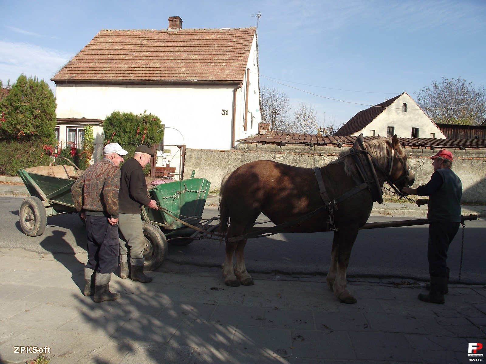 19 października 2013 , Ulica Staromiejska w sobotnie popołudnie. Wprzęganie starego konia do wozu przez trzech panów w równie zaawansowanym wieku. Za nimi widoczna posesja nr 31.Skomentuj zdjęcie