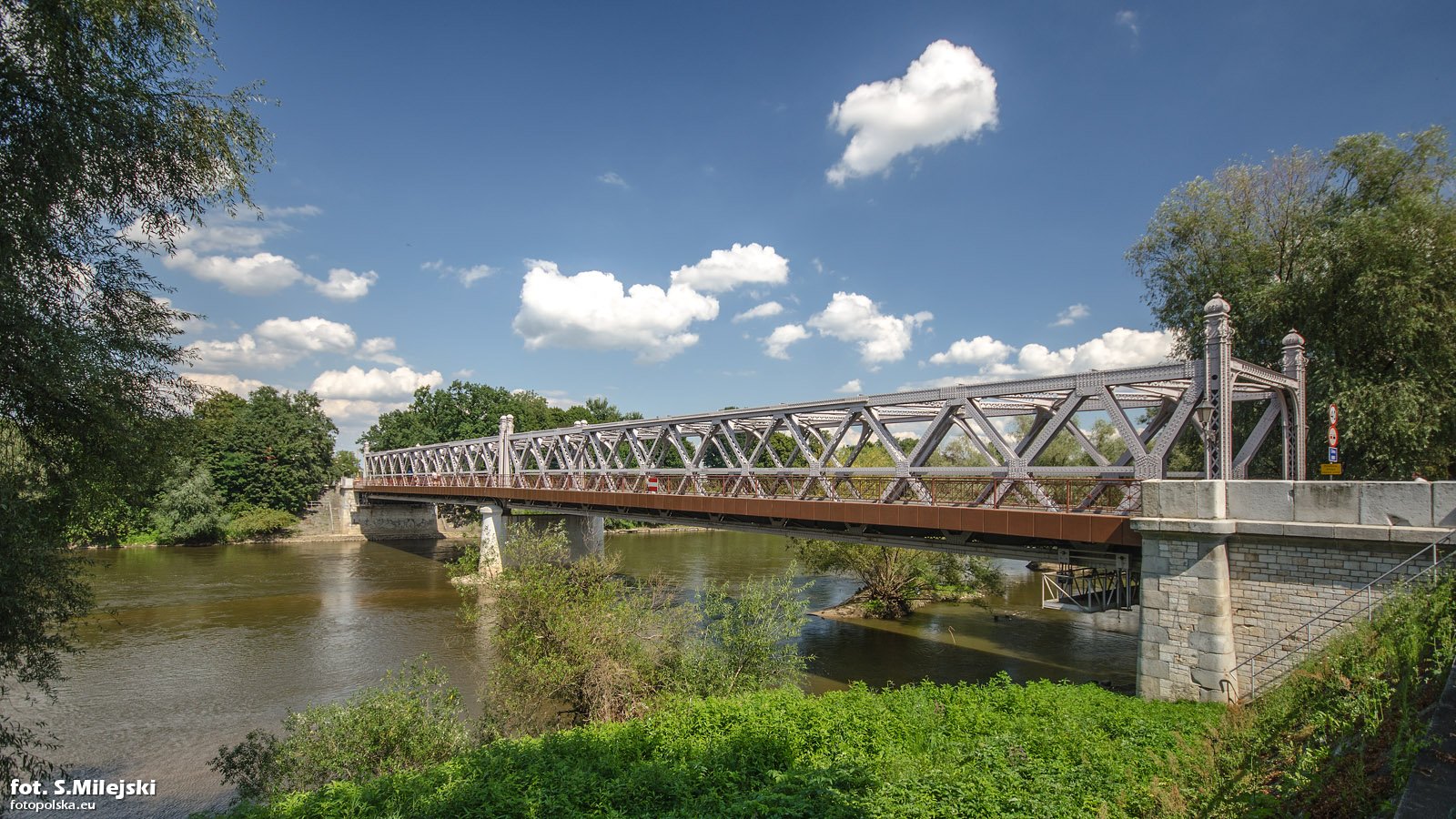 Most Piastowski więcej zdjęć (70) Zbudowano: 1953-1954 Dzięwiętnastowieczny most kratownicowy przeniesiony z podbydgoskiego Fordonu w 1953 roku i zamontowany na miejscu zniszczonego w 1945 roku tzw. Mostu Fryderyka. Zapewnia komunikację w kierunku północ-południe. Most drogowy „Piastowski” nad Odrą wzniesiono w latach 1953-1954. Zaadaptowano wówczas dwa przęsła zabytkowego mostu kolejowo-drogowego zbudowanego w 1893 r. na Wiśle pod Bydgoszczą, a zniszczonego częściowo w 1939 r. Autorem projektu mostu był inż. Waldemar Uchański. Most ma konstrukcję kratownicową utworzoną z kątowników stalowych, dwuprzęsłową długości 120,2 m, typową dla rozwiązań z końca XIX w. za /p> ul. Krakusa więcej zdjęć (221) |