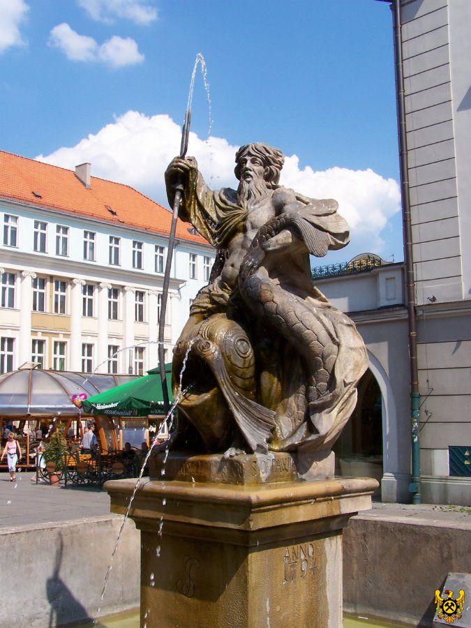 Fontanna z posągiem Neptuna więcej zdjęć (48) Atrakcja turystyczna Zbudowano: 1794 Zabytek: B/567/82 Fontannę stworzył w 1794 r., tak jak Matkę Boską ze wschodniej elewacji Johann Nitsch, znany rzeźbiarz z Opawy. Dwa lata wcześniej rozpoczęto budowę kanału Kłodnickiego, który w szybki sposób połączył miasto z Bałtykiem. Jak się śmieją gliwiczanie, umożliwiło to dopłynięcie Neptuna do miasta. Rzeźba przedstawia Neptuna siedzącego na delfinie , z trójzęba, który trzyma on w prawej ręce wytryskuje woda. Na cokole znajduje się informacja o autorze i data powstania fontanny. Rynek więcej zdjęć (468) Dawniej: Ring |