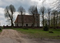 kwiecień 2013 , Kościół jednonawowy, prosta bryła nakryta dachem dwuspadowym, z tyłu owalne prezbiterium. Na osi wejscia przybudowana dwukondygnacyjna wieża nakryta dachem namiotowym. Teren przykościelny otoczony murem. Wokół kościoła czynny cmentarz z zachowanymi nagrobkami dawnych mieszkańców wsi.Skomentuj zdjęcie