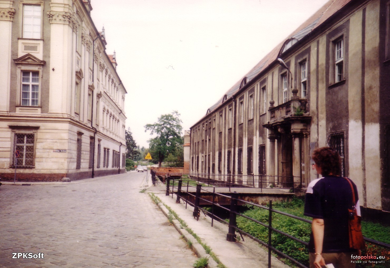 29 lipca 1993 , Fragment ul. Grodzkiej, po lewej południowa elewacja dawnego pałacu biskupiego (obecnie muzeum). Po prawej Dwór Biskupi, którego początki sięgają XIII w. Na zdjęciu widoczna brama przejazdowa, oraz fosa będąca pozostałością dawnego systemu obronnego tego obiektu. Na portalu owej bramy umieszczono tabliczki z zaznaczonym poziomem wody w czasie kolejnych powodzi, które nawiedziły miasto.Skomentuj zdjęcie |