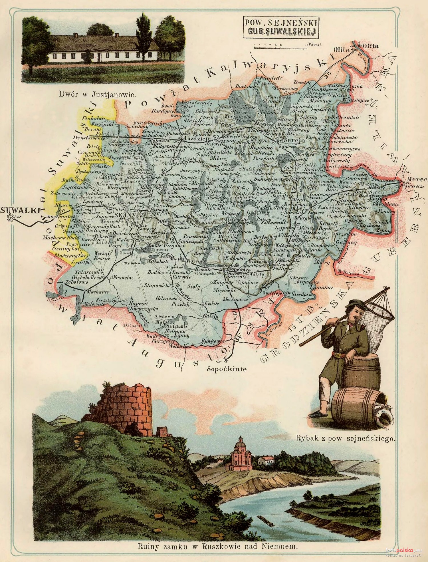 1907 , Sejny - Mapa Powiat Sejneński - Guberni Suwalskiej, dwór Abłamowiczów w Justianowie i zamek w Ruszkowie. Atlas Geograficzny Ilustrowany Królestwa Polskiego, J. M. Bazewicz 1907Skomentuj zdjęcie