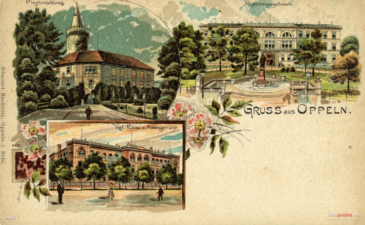 Lata 1891-1897 , Litografia ukazująca trzy nieisniejące już dziś obiekty, które kiedyś stanowiły wizytówkę miasta - Zamek Piastowski, gmach rejencji oraz gmach Sądu Krajowego i Rejonowego.Skomentuj zdjęcie