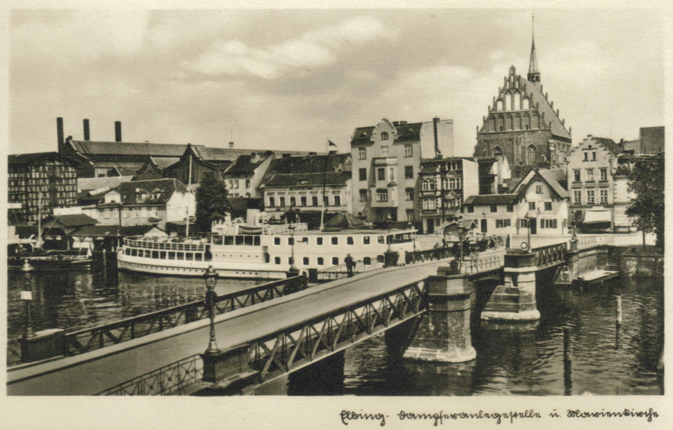 Dla połączenia Starego Miasta z Wyspą Spichrzów od zarania istniały dwa promy i most Hohe Brücke. Później, pod koniec wieku XVI (czasy Anglików w Elblągu) zbudowano w górze rzeki most Leegen-Brücke i blisko niego bramę i wieżę wagową z dużą, nową wagą.
