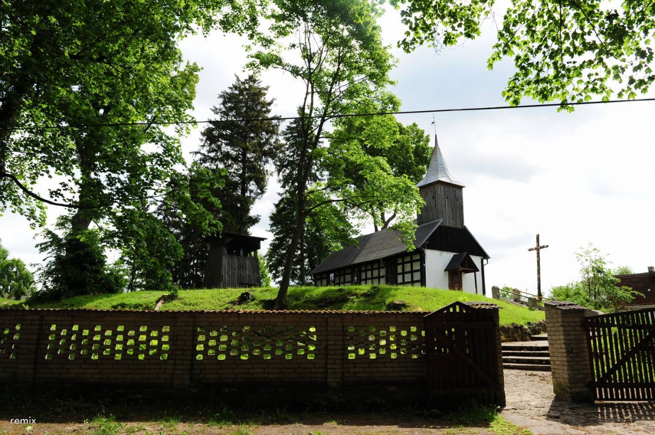 2012 , Kościół, dawny zbór ewangelicki p.w. MB Częstochowskiej z 1680 r. Rozbudowany o zakrystię w poł. XIX w. W 1946 r. przejęty przez kościół katolicki. Kościół szachulcowy, konstrukcji słupowo – ramowej. Orientowany. Salowy, bez wyodrębnionego prezbiterium z nawy, zamknięty prostokątnie. Zakrystia z tyłu kościoła w kształtem przypominająca trójbocznie zamknięte prezbiterium. Wieża drewniana od frontu, osadzona na nawie. Zwieńczona blaszanym hełmem iglicowym. Dach jednokalenicowy, kryty papą. Wewnątrz zachowana empora. Ołtarz główny z elementami późnorenesansowymi (typu niderlandzkiego) z 1517 r. Drewniana kwadratowa dzwonnica, kryta dachem dwuspadowym.Skomentuj zdjęcie |
