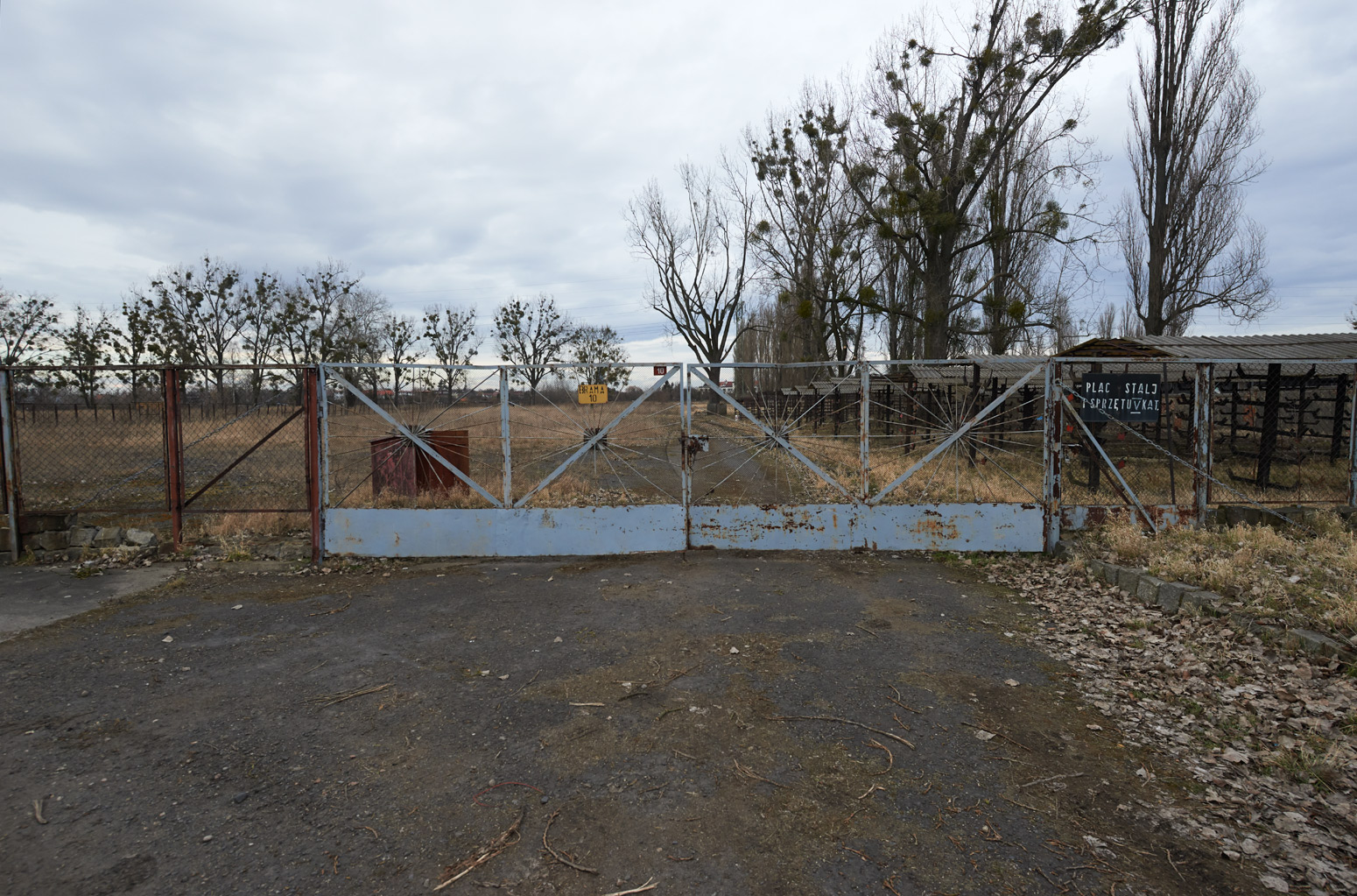 16 lutego 2014 , Brama nr 10 prowadząca na rozległy, ogrodzony i prawie pusty teren. Za bramą plac stali i sprzętu V kat.Skomentuj zdjęcie