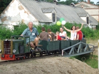 15 sierpnia 2010 , Kolejka parkowa w akcji, jako motorniczy jej twórca i właściciel Roman Witkowski. W tle budynki folwarku.Skomentuj zdjęcie |